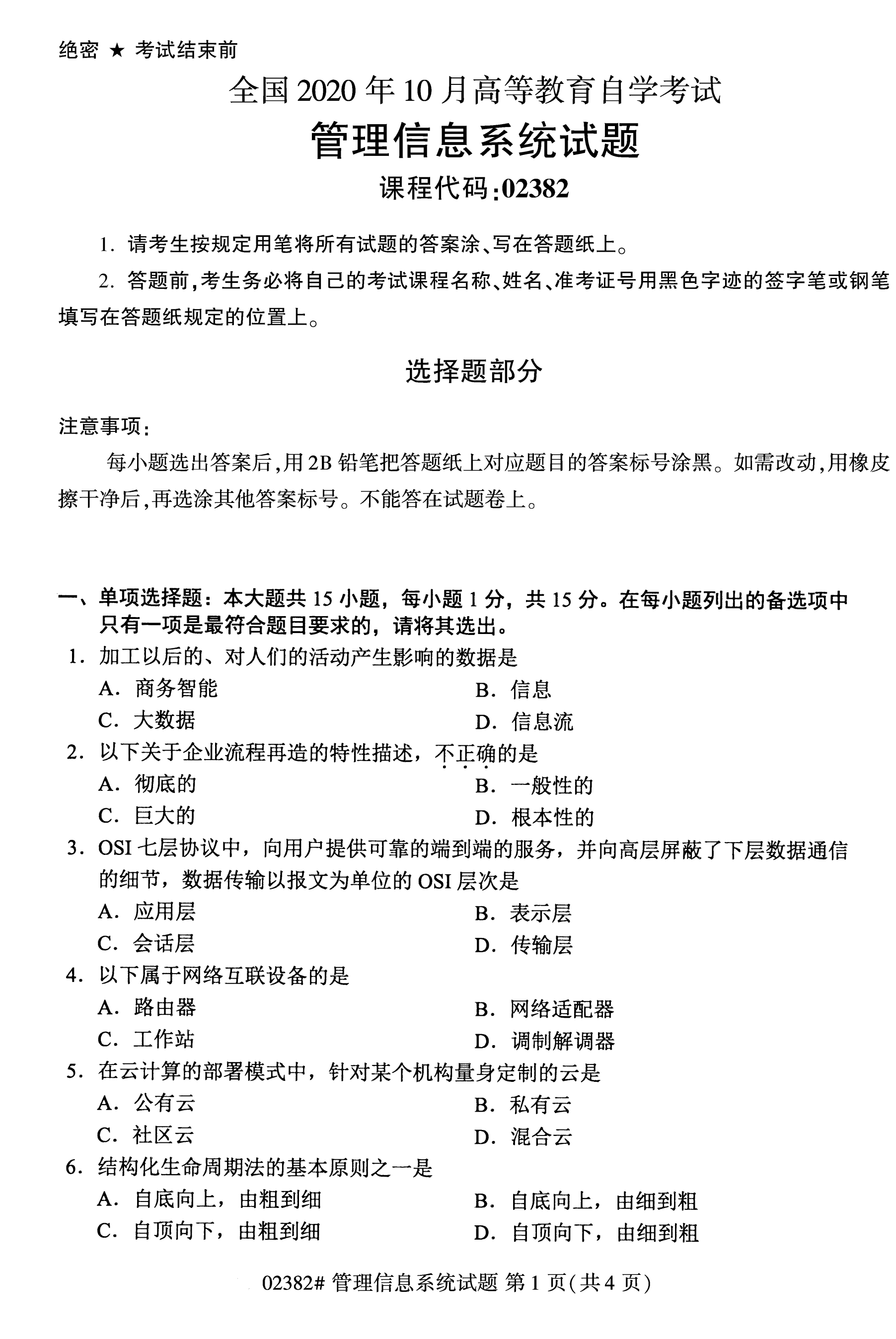 福建自考全國卷管理信息系統(tǒng)(02382)試題